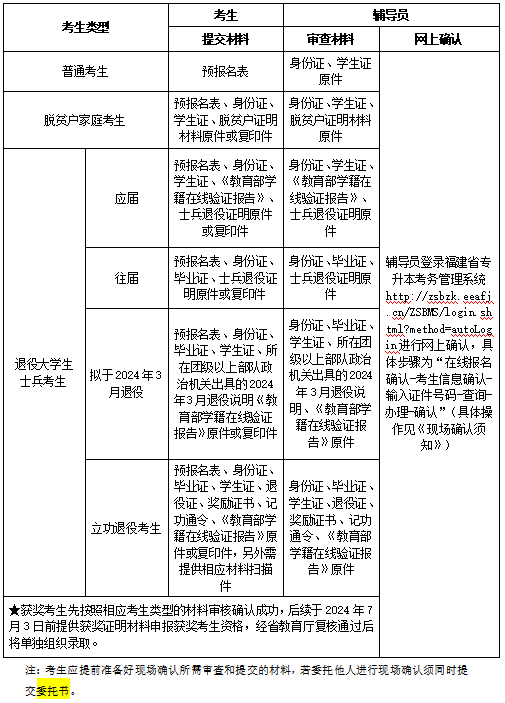 网上报名并缴费成功的退役大学生士兵考生须于2023年12月21日至25日,持本人士兵退役证明(拟于2024年3月退役的大学生士兵应提供所在团级以上部队政治机关出具的2024年3月退役说明)、居民身份证、毕业证书等原件和复印件,2024年毕业的应届退役大学生士兵还需提供《学生证》和在中国高等教育学生信息网打印本人的《教育部学籍在线验证报告》;在部队荣立三等功以上奖励并完成高职(专科)学业的退役大学生士兵考生(简称“立功退役考生”)还需携带退役证、奖励证书、记功通令等材料原件和复印件,到指定确认地点办理报名现场确认手续,逾期不再受理。省教育厅将会同省退役军人事务厅对退役大学生士兵及其立功资格进行复核。对不符合退役大学生士兵条件的考生,将于2024年1月20日前由高校通知考生可转为普通考生。如考生不愿意转或不符合普通考生报考条件,视为报名无效并退还报名费。